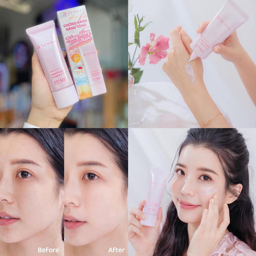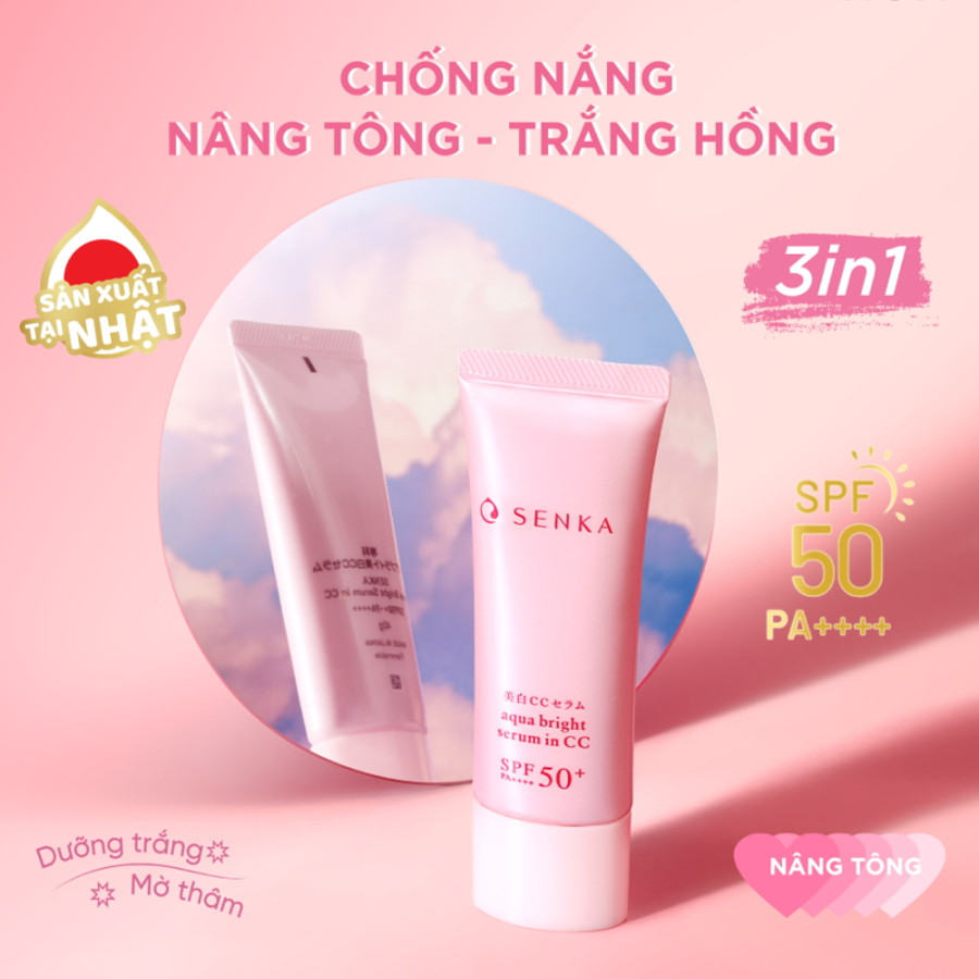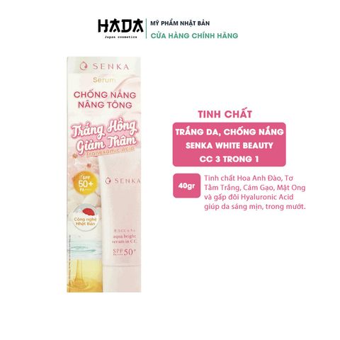 - Serum Dưỡng Trắng Da Senka Kết Cấu CC White Beauty CC Serum giúp giảm thâm nám, sạm mụn và tàn nhang trên da nhờ vào phức hợp làm trắng M-Tranexamic acid, Tinh chất Hoa Anh Đào, Tơ Tằm Trắng, Cám Gạo, Mật Ong, giúp da trắng hồng, trong mướt.