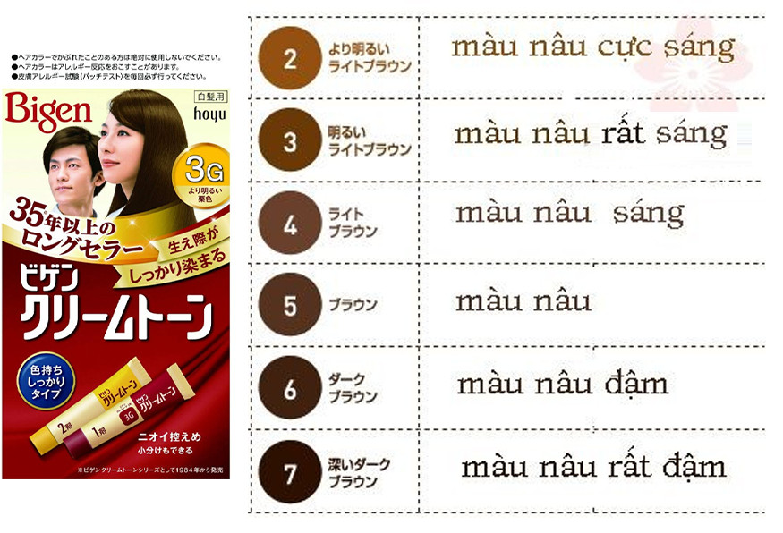 Thuốc nhuộm tóc Bigen gồm các mã màu sau: